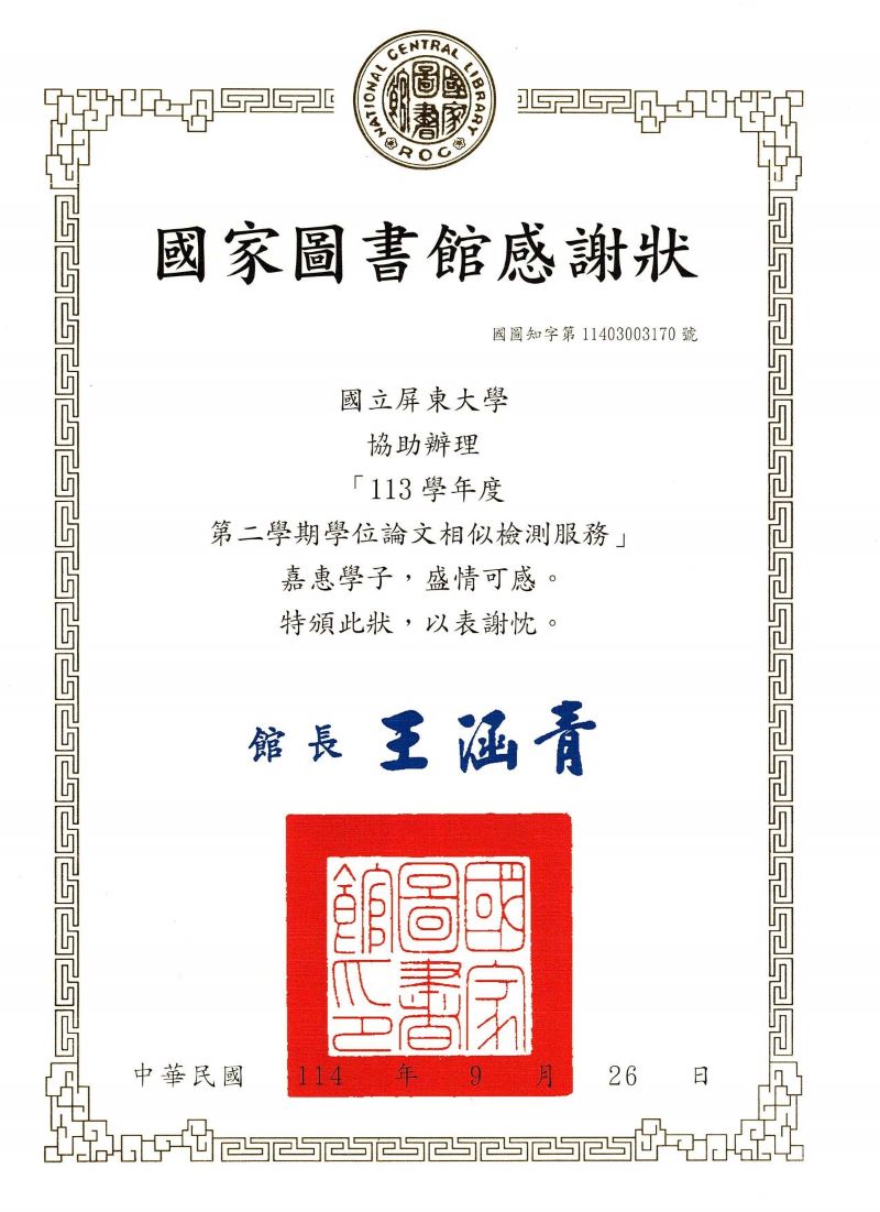 榮獲國家圖書館「學位論文取用-電子全文下載率」、「學位論文開放-電子全文授權率」、「113學年度第二學期學位論文相似檢測服務」三項獎狀, 表彰本校於學位論文被下載與授權方面之優異表現,暨協助國家圖書館推動論文相似度檢測服務之貢獻。