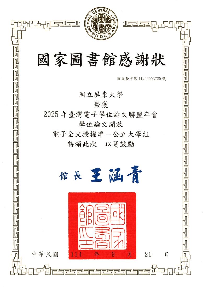 榮獲國家圖書館「學位論文開放 – 電子全文授權率」獎狀,表彰本校於112學年度學位論文授權率與其他公立綜合大學達100%之貢獻。